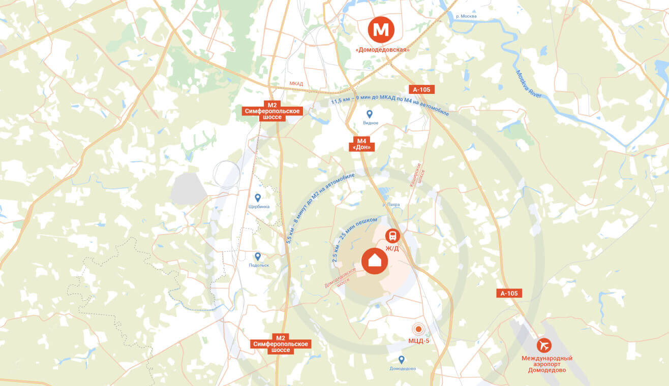 До ЖК легко добраться разными видами транспорта – на муниципальном автобусе или маршрутке от ст.м. «Домодедовская», электричках Павелецкого направления или на машине.